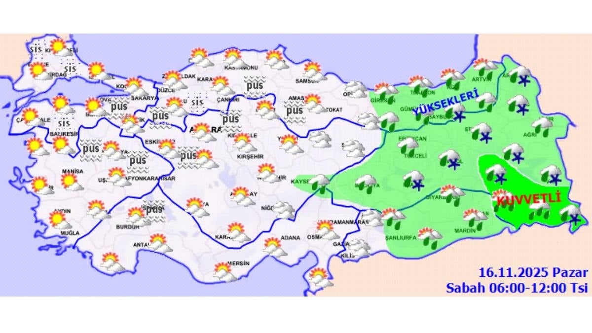 Meteoroloji, Bitlis, Muş, Siirt, Şırnak ve Hakkari çevreleri ile Van’ın güneybatısında yağışların zaman zaman kuvvetleneceğini bildirdi. Marmara, İç Ege, Batı Akdeniz’in iç kesimleri, İç Anadolu’nun kuzeybatısı ile Batı ve Orta Karadeniz’in iç bölgelerinde sabah ve gece saatlerinde yer yer pus ve sis bekleniyor.