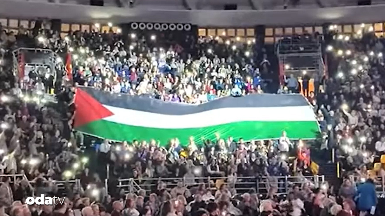 Konser sırasında salonun tamamına devasa bir Filistin bayrağı açıldı. Binlerce izleyici cep telefonu ışıklarıyla salonu aydınlatırken, dev ekranda Filistin’e destek mitinglerinden görüntüler, kalabalıklar önünde yapılan konuşmalar ve Filistin için düzenlenen konserlerden kesitler gösterildi.