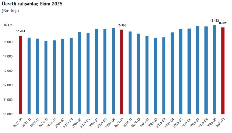 Buna göre, sanayi, inşaat ve ticaret-hizmet sektörleri toplamında ücretli çalışan sayısı 2025 Ekim ayında bir önceki yılın aynı ayına göre yüzde 1,0 arttı. Ücretli çalışan sayısı bir önceki yılın aynı ayında 15 milyon 860 bin 31 kişi iken, 2025 yılı Ekim ayında 16 milyon 20 bin 394 kişi oldu.